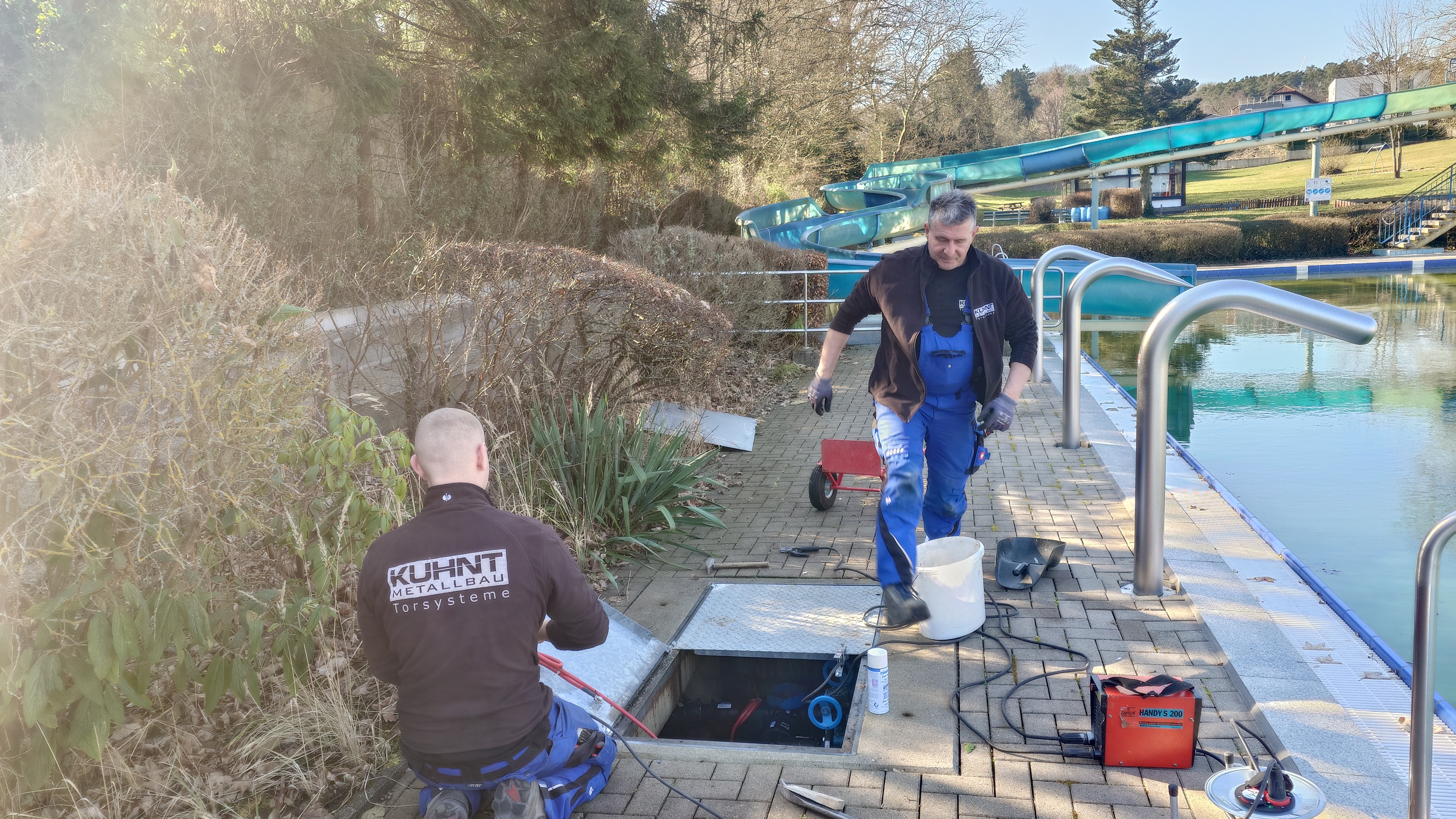 wie zum Beispiel heute die Firma Kuhnt Metallbau Torsysteme mit Schweißarbeiten an den Abdeckungen des Schachtes für die Attraktionspumpe; siehe Foto.
